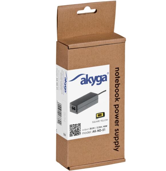 Hálózati töltő, 20V, 2,25A, 45W, Slim Tip, Lenovo/IBM Az Akyga® AK-ND-51 egy notebook dedikált tápegység a 20V / 2.25A, 45W teljesítményű és a Slim Tip (más néven SQUARE YELLOW) csatlakozóval ellátott készülékek számára. A tápegység kábele magas színvonalú ferritmaggal van felszerelve, amely megakadályozza és védi az eszközöket bármely lehetséges üzemmódáramtól és nagy frekvenciájú zajtól. A védőkészlet (OVP, OTP, OPP, SCP és OCP) 100% biztonságos, stabil munkát garantál a tápegység számára....