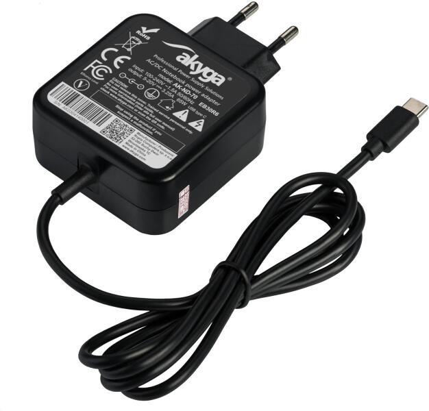 Akyga AK-ND-70 65W USB type-C töltő adapter Az Akyga AK-ND-70 egy tápegység, amely 20 V / 3.00 - 3.25A, 65W teljesítményű és USB type C dugaszolóaljzattal működik. A készülék C típusú USB kimeneti csatlakozóval van ellátva, egy 1,2 m hosszú kábellel. A Quick Charge 3.0 és Power Delivery támogatásnak köszönhetően az ezzel a technológiával kompatibilis eszközök töltési ideje akár negyedére is lecsökkenhet, és az energiaellátás hatékonysága önmagában meghaladja a 80% -ot. Minden Akyga tápegységet környezetbarát EcoBox típusú csomagolásba csomagolnak. A készülék a C típusú USB-porttal felszerelt eszközök, például okostelefonok, táblagépek és notebookok töltésére készült. JellemzőkTermékkód AK-ND-70Terméktípus AC/DC adapterSorozat DedikáltTápfeszültség 100-250 VEnergiafelhasználás < 1.5 AHatékonyság > 80 %Kimeneti feszültség 5 - 20 VKimeneti áramerősség 3.00 - 3.25AOutlet kábel hossza 1.2 mKimeneti csatlakozó USB type-CTöltési technológia Quick Charge 3.0Maximális teljesítmény 65 WTápbemenet CEE 7/16 (Europlug)Mechanikus kapcsoló nincsOVP IgenOCP IgenOPP IgenOTP IgenSCP IgenFerritszűrős IgenAnyag ABSTermék színe FeketeMTBF 100000 hHőmérséklet 5 - 50 °CCsomag EcoBoxTermék mérete (L x W x H) 99 x 60 x 30 mmA csomag mérete (L x W x H) 190 x 90 x 38 mmTápkábelt nem tartalmazNettó tömeg 210 gBruttó súly 249 gCE megfelelőségi IgenFCC megfelelőségi IgenRoHS megfelelőségi IgenREACH megfelelőségi Igen