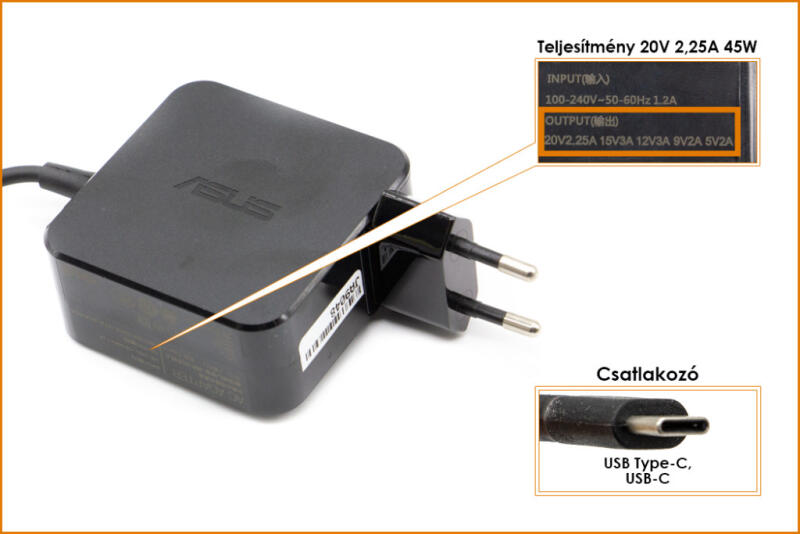 | eMAG termék név | Asus gyári 5V/9V/12V/15V/20V 2-3A/2,25A 45W USB-C töltő (0A001-00238500) |