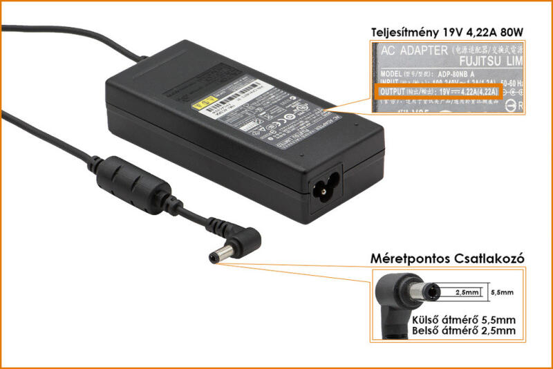 | eMAG termék név | Fujitsu Limited 19V 4.22A 80W gyári új töltő (FMV-AC325 , CP293664-01) |